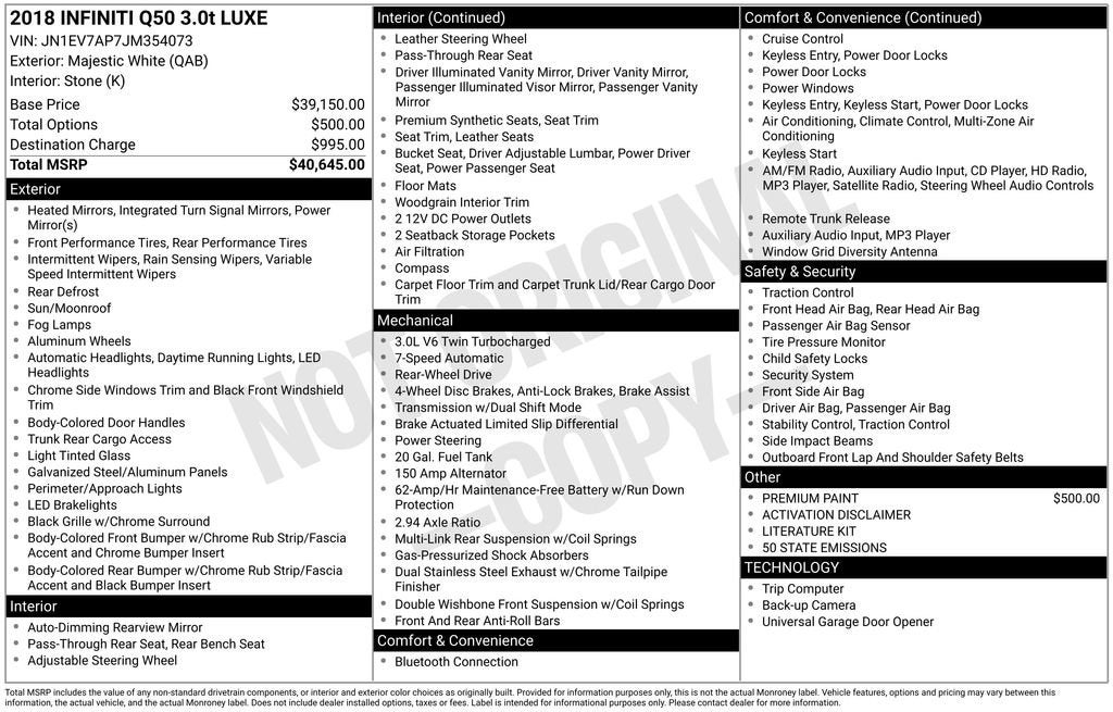 Discover the exceptional 2018 INFINITI Q50 3.0t LUXE, a sophisticated and dynamic sedan that seamlessly blends style, performance, and cutting-edge technology. This meticulously maintained vehicle is poised to elevate your driving experience.- Remote keyless entry- Steering wheel mounted audio controls- Power moonroof- Front fog lights- Fully automatic headlights- Security system- Garage door transmitter: HomeLink- Telescoping steering wheel- Tilt steering wheel- 18 x 7.5 Aluminum Alloy Wheels- Rain sensing wipersIndulge in the luxurious features that set this INFINITI apart, including:- Local trade with a clean accident history- Rain sensing windshield wipers- Dual zone automatic climate control- 8-way power driver and front passenger seats- Premium paintThe 3.0L V6 engine and 7-Speed Automatic with Manual Shift transmission deliver an exhilarating driving experience, while the rear-wheel-drive configuration provides exceptional handling and control. With an impressive 20 MPG in the city and 29 MPG on the highway, this Q50 offers a compelling balance of power and efficiency.Elevate your commute and weekend adventures with the advanced technology and premium amenities of this INFINITI Q50. The backup camera, SiriusXM radio, and dual-zone automatic climate control are just a few of the features that will enhance your driving experience.Discover the joy of ownership with this meticulously maintained 2018 INFINITI Q50 3.0t LUXE. Schedule a test drive today and experience the exceptional craftsmanship and performance that define this remarkable sedan.We are the #1 VOLUME GMC DEALER IN KENTUCKY! Every effort is made to ensure the accuracy of the information contained in this classified listing. Dealer is not responsible for errors or omissions as much of the information is compiled from 3rd party data source feeds. PRINT & BRING US THIS PAGE to the dealership for a 100% accurate equipment list of accessories, equipment & vehicle history. Late evening and Sunday appointments are available. Proudly serving: Bowling Green, Nashville, Hopkinsville, Clarksville, Campbellsville, Elizabethtown, Lebanon, Louisville, Russell Springs, Owensboro, Horse Cave, and greater Kentucky and middle Tennessee.