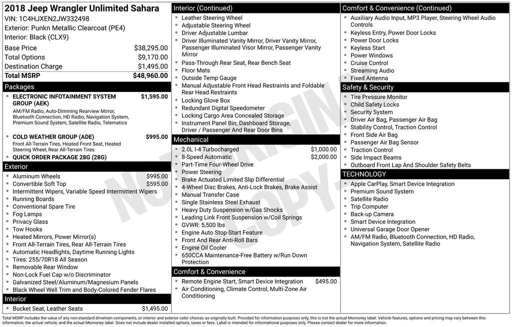 The Wrangler Unlimited's powerful 2.0L turbocharged engine, paired with an 8-speed automatic transmission and legendary 4-wheel drive, deliver exceptional performance and capability. Enjoy the convenience of the Cold Weather Group, which includes heated seats and steering wheel, as well as the Electronic Infotainment System Group, providing seamless connectivity and advanced technology.