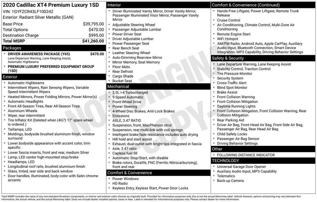 Discover the perfect blend of style, performance, and technology in this stunning 2020 Cadillac XT4 Premium Luxury. This exceptional crossover SUV is ready to elevate your driving experience and turn heads wherever you go.Boasting a sleek silver exterior and a well-appointed interior, this XT4 is packed with an impressive array of features that cater to your every need. Key highlights include:- APPLE CARPLAY * ANDROID AUTO- DRIVER AWARENESS PACKAGE- LOCAL TRADE * CLEAN ACCIDENT HISTORY- Driver Awareness Package: Following Distance Indicator, Lane Keep Assist with Lane Departure Warning, and IntelliBeam- Preferred Equipment Group 1SDStep inside and you'll be surrounded by premium amenities that redefine luxury. Enjoy the convenience of a 7-speaker audio system, the intuitive Cadillac User Experience infotainment system, and dual-zone automatic climate control. The power-adjustable driver's seat with memory settings and the leather-wrapped steering wheel with mounted audio controls add an extra touch of refinement.Under the hood, the 2.0L I4 Turbocharged engine delivers an impressive balance of power and efficiency, with an EPA-estimated 24 city/30 highway MPG. The 9-speed automatic transmission and front-wheel-drive configuration ensure a smooth and responsive driving experience.Safety is also a top priority, with features like Automatic Emergency Braking, Lane Keep Assist with Lane Departure Warning, and the Rear Vision Camera keeping you and your loved ones protected on the road.Whether you're commuting to the office or embarking on a weekend getaway, this 2020 Cadillac XT4 Premium Luxury is the perfect companion. Experience the ultimate in style, comfort, and technology by scheduling a test drive today.We are the #1 VOLUME GMC DEALER IN KENTUCKY! Every effort is made to ensure the accuracy of the information contained in this classified listing. Dealer is not responsible for errors or omissions as much of the information is compiled from 3rd party data source feeds. PRINT & BRING US THIS PAGE to the dealership for a 100% accurate equipment list of accessories, equipment & vehicle history. Late evening and Sunday appointments are available. Proudly serving: Bowling Green, Nashville, Hopkinsville, Clarksville, Campbellsville, Elizabethtown, Lebanon, Louisville, Russell Springs, Owensboro, Horse Cave, and greater Kentucky and middle Tennessee.