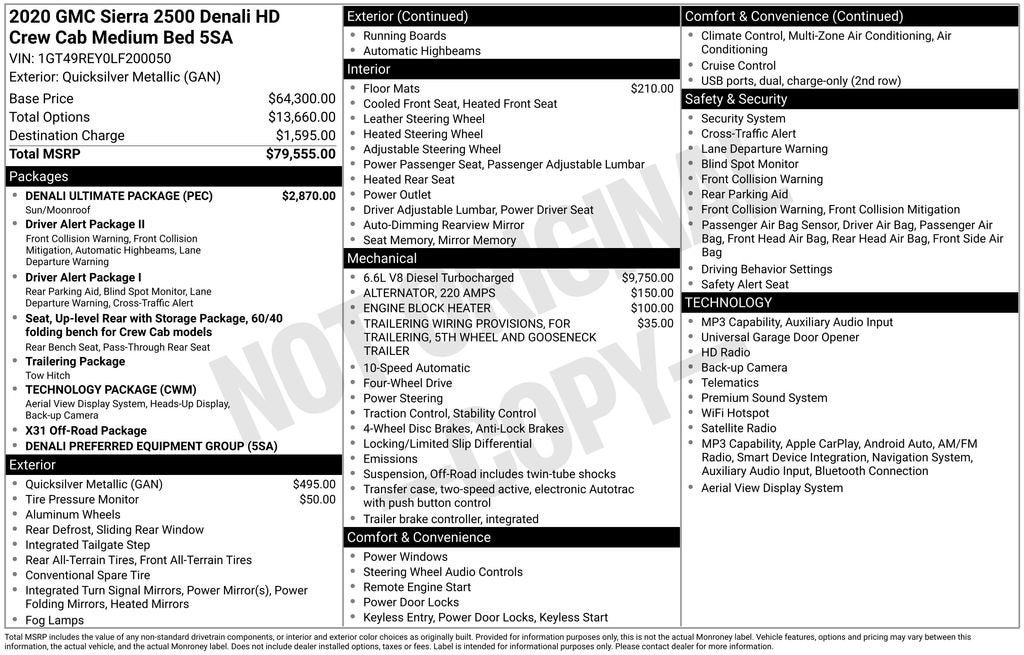 Elevate your driving experience with this exceptional 2020 GMC Sierra 2500HD Denali. Boasting a powerful Duramax 6.6L V8 Turbodiesel engine and a sleek Silver exterior, this truck is built to conquer any terrain.- Denali Ultimate Package- HD Surround Vision with 2 Trailer View Camera Provisions- Power Sunroof- One Owner Local Trade with Clean Accident HistoryThe Sierra 2500HD Denali is engineered to tackle the toughest jobs with ease. Its robust 4WD system, 10-Speed Automatic transmission, and impressive towing capacity make it the perfect companion for your work or adventure needs. Step inside the luxurious cabin and experience the comfort of heated and ventilated front seats, a heated steering wheel, and a premium Bose sound system.This truck is packed with cutting-edge technology, including a 15-inch Head-Up Display, wireless charging, and a 360-degree camera system to assist with parking and trailering. The Denali's advanced safety features, such as Automatic Emergency Braking and Lane Departure Warning, provide you and your passengers with added peace of mind on the road.Whether you're hauling heavy loads, towing a trailer, or simply seeking a premium driving experience, the 2020 GMC Sierra 2500HD Denali is the perfect choice. Its uncompromising capability, refined styling, and exceptional attention to detail make it a true standout in the heavy-duty truck segment.Don't miss your chance to own this remarkable vehicle. Schedule a test drive today and experience the power and luxury of the Sierra 2500HD Denali for yourself.We are the #1 VOLUME GMC DEALER IN KENTUCKY! Every effort is made to ensure the accuracy of the information contained in this classified listing. Dealer is not responsible for errors or omissions as much of the information is compiled from 3rd party data source feeds. PRINT & BRING US THIS PAGE to the dealership for a 100% accurate equipment list of accessories, equipment & vehicle history. Late evening and Sunday appointments are available. Proudly serving: Bowling Green, Nashville, Hopkinsville, Clarksville, Campbellsville, Elizabethtown, Lebanon, Louisville, Russell Springs, Owensboro, Horse Cave, and greater Kentucky and middle Tennessee.