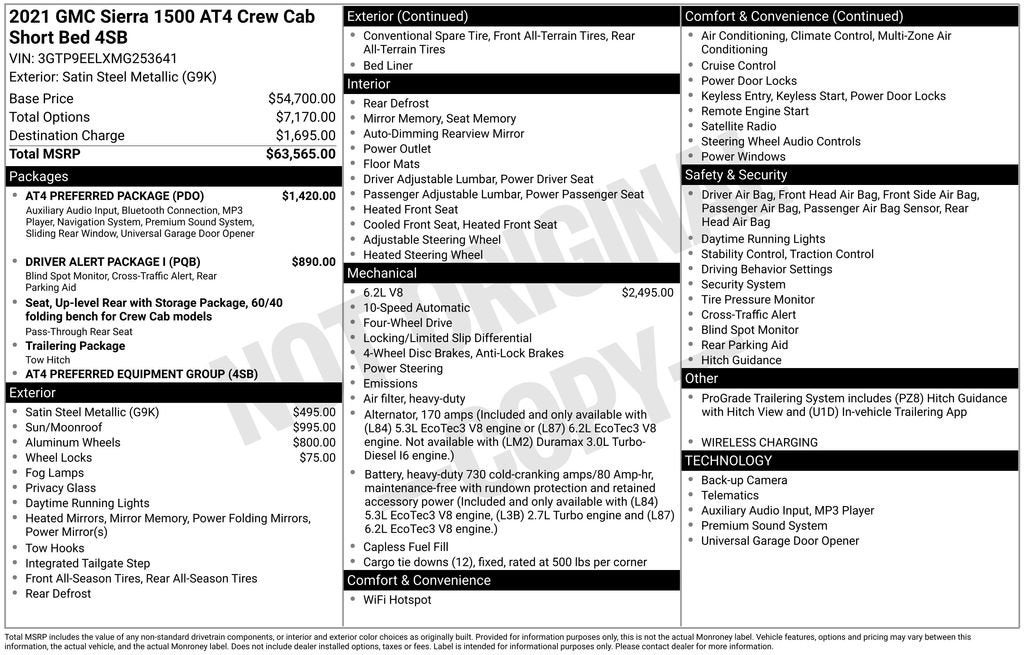 Elevate Your Driving Experience with this Exceptional 2021 GMC Sierra 1500 AT4Discover the perfect blend of power, capability, and refined sophistication in this 2021 GMC Sierra 1500 AT4. With its commanding presence and meticulously crafted interior, this truck is poised to elevate your driving experience to new heights.- LOCAL TRADE * CLEAN ACCIDENT HISTORY- GM CERTIFIED PRE-OWNED * PREFERRED PACKAGE- POWER SUNROOF * DRIVER ALERT I PACKAGE- 6.2L V8 EcoTec3 Engine with Dynamic Fuel Management- AT4 Preferred Package- Driver Alert Package I- Preferred Equipment Group 4SB- Trailering PackageStep inside and be captivated by the premium Bose 7-speaker sound system, the intuitive Premium GMC Infotainment System with navigation, and the convenience of wireless charging. The heated and ventilated front seats, power sunroof, and a host of advanced safety features ensure your comfort and peace of mind on every journey.Engineered for exceptional off-road performance, this Sierra 1500 AT4 is equipped with an off-road-tuned suspension, an electronic locking rear differential, and Hill Descent Control. Whether you're tackling rugged terrain or navigating the city streets, this truck is ready to take on any challenge with confidence.Backed by the renowned GMC Certified Pre-Owned program, this Sierra 1500 AT4 has undergone a rigorous 172-point inspection and comes with a comprehensive warranty, roadside assistance, and a 3-month SiriusXM trial subscription. Experience the unparalleled quality and peace of mind that comes with owning a Certified Pre-Owned GMC.Don't miss your chance to make this exceptional 2021 GMC Sierra 1500 AT4 your own. Schedule a test drive today and discover the true power and versatility of this remarkable truck.We are the #1 VOLUME GMC DEALER IN KENTUCKY! Every effort is made to ensure the accuracy of the information contained in this classified listing. Dealer is not responsible for errors or omissions as much of the information is compiled from 3rd party data source feeds. PRINT & BRING US THIS PAGE to the dealership for a 100% accurate equipment list of accessories, equipment & vehicle history. Late evening and Sunday appointments are available. Proudly serving: Bowling Green, Nashville, Hopkinsville, Clarksville, Campbellsville, Elizabethtown, Lebanon, Louisville, Russell Springs, Owensboro, Horse Cave, and greater Kentucky and middle Tennessee.