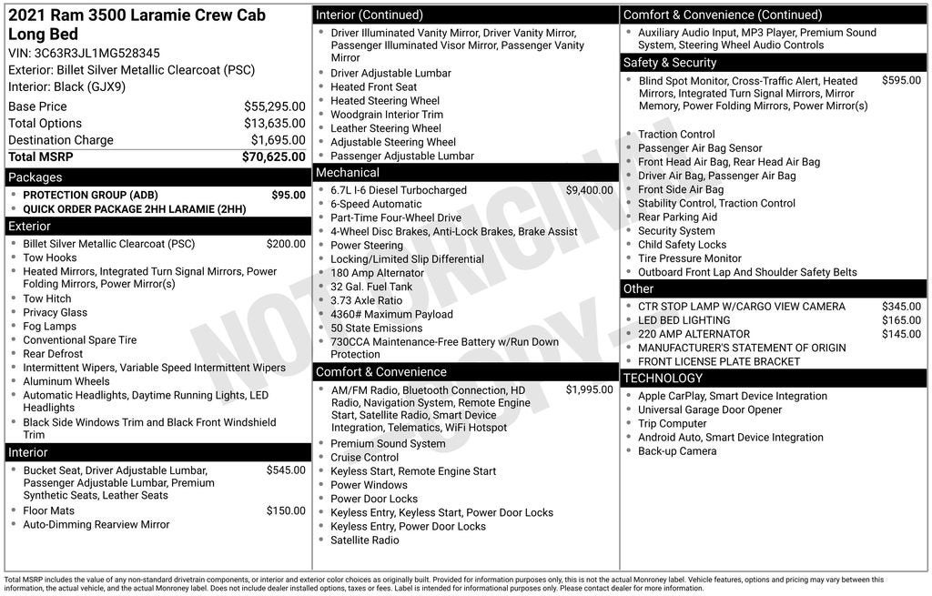 Discover the power and capability of this 2021 Ram 3500 Laramie. This impressive heavy-duty truck is equipped with a robust Cummins 6.7L I6 Turbodiesel engine, delivering uncompromising performance and impressive towing capacity. Boasting a sleek Silver exterior and a well-appointed Leather-trimmed interior, this Ram 3500 Laramie is ready to take on any challenge with style and confidence.- Local trade-in with a clean accident history- Cummins 6.7L I6 Turbodiesel engine- Uconnect 12.0 with Navigation and 12-inch touchscreen display- Blind Spot and Cross Path Detection- Power chrome tow mirrors with memory and convex spotter mirrors- Leather-trimmed bucket seats with power adjustable lumbar support- Center stop lamp with cargo view camera- Protection Group with transfer case skid plate shieldThis Ram 3500 Laramie is packed with premium features that elevate your driving experience. The Uconnect 12.0 system with navigation provides seamless connectivity and advanced infotainment, while the Blind Spot and Cross Path Detection system enhances your awareness on the road. The power chrome tow mirrors with memory and convex spotter mirrors offer increased visibility and convenience, and the leather-trimmed bucket seats with power adjustable lumbar support ensure unparalleled comfort.Designed to tackle the toughest jobs, this Ram 3500 Laramie is the perfect companion for your work, adventure, or family needs. With its impressive capability, sophisticated technology, and premium amenities, this truck is a true standout in the heavy-duty segment.Experience the exceptional power, capability, and refinement of this 2021 Ram 3500 Laramie. We invite you to schedule a test drive and discover how this remarkable truck can elevate your driving experience. Our knowledgeable sales team is ready to answer any questions and help you find the perfect vehicle to meet your needs.We are the #1 VOLUME GMC DEALER IN KENTUCKY! Every effort is made to ensure the accuracy of the information contained in this classified listing. Dealer is not responsible for errors or omissions as much of the information is compiled from 3rd party data source feeds. PRINT & BRING US THIS PAGE to the dealership for a 100% accurate equipment list of accessories, equipment & vehicle history. Late evening and Sunday appointments are available. Proudly serving: Bowling Green, Nashville, Hopkinsville, Clarksville, Campbellsville, Elizabethtown, Lebanon, Louisville, Russell Springs, Owensboro, Horse Cave, and greater Kentucky and middle Tennessee.