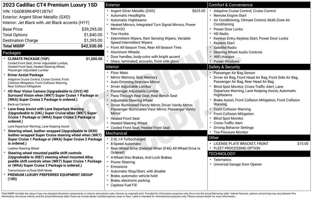Elevate Your Driving Experience with the Exceptional 2023 Cadillac CT4 Premium LuxuryIndulge in the refined elegance and exceptional performance of the 2023 Cadillac CT4 Premium Luxury. This meticulously maintained, one-owner vehicle boasts a stunning Silver exterior and a host of premium features that will elevate your driving experience.• CADILLAC CERTIFIED PRE-OWNED * ONE OWNER• CLIMATE PACKAGE * HEATED AND VENTILATED FRONT SEATS * HEATED STEERING WHEEL• CADILLAC USER EXPERIENCE WITH APPLE CARPLAY AND ANDROID AUTO• Climate Package• Preferred Equipment Group 1SDThe CT4 Premium Luxury is powered by a 2.0L Turbocharged engine, delivering an impressive 23 city/34 highway MPG. Enjoy the responsiveness and control of the 8-Speed Automatic transmission with Rear-Wheel Drive.This Cadillac is packed with an array of premium features to enhance your driving pleasure, including:• Premium 8-Speaker Audio System• Automatic Temperature Control• Heated and Ventilated Front Seats• Heated Steering Wheel• Apple CarPlay and Android Auto• Dual Digital Driver Information Center Display• Leather-Wrapped Steering Wheel• Steering Wheel Mounted Paddle Shift Controls• Leather Seating Surfaces• Rain-Sensing WipersCadillac's commitment to quality and customer satisfaction is evident in the Certified Pre-Owned program that backs this vehicle. With a 172-point inspection, roadside assistance, a transferable warranty, and a host of other benefits, you can drive with confidence and peace of mind.Discover the exceptional value and unparalleled driving experience of the 2023 Cadillac CT4 Premium Luxury. Visit our showroom today and let us demonstrate how this remarkable vehicle can elevate your daily commute and weekend adventures.#1 VOLUME GMC DEALER IN KENTUCKY! Price includes Leachman Discount, Applicable Rebate.CERTIFIED PRE-OWNEDFUEL SAVERHEATED/COOLED SEATSLEATHERONE OWNERRECENT TRADE INREMAINDER OF FACTORY WARRANTYINCLUDES WARRANTYSTEERING WHEEL MOUNTED AUDIO, Bluetooth®, AND CRUISE CONTROLSTILT AND TELESCOPING STEERING COLUMNHEATED STEERING WHEELREMOTE STARTBACKUP CAMERACadillac Certified Pre-Owned172 Point Inspection, Roadside Assistance, Warranty Deductible: $0, Transferable Warranty, Vehicle History, Limited Warranty: 12 Month/Unlimited Mile (whichever comes first) after new car warranty expires or from certified purchase date, Courtesy transportation & 24 hour Roadside Assistance for the life of the warranty and stringent 172-point inspection & reconditioning process. SiriusXM 3-month trial subscription.We are the #1 VOLUME GMC DEALER IN KENTUCKY! Every effort is made to ensure the accuracy of the information contained in this classified listing. Dealer is not responsible for errors or omissions as much of the information is compiled from 3rd party data source feeds. PRINT & BRING US THIS PAGE to the dealership for a 100% accurate equipment list of accessories, equipment & vehicle history. Late evening and Sunday appointments are available. Proudly serving: Bowling Green, Nashville, Hopkinsville, Clarksville, Campbellsville, Elizabethtown, Lebanon, Louisville, Russell Springs, Owensboro, Horse Cave, and greater Kentucky and middle Tennessee.
