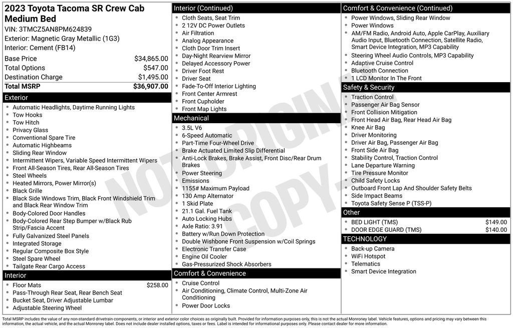 Discover the perfect blend of power, capability, and modern convenience in the 2023 Toyota Tacoma SR V6. This exceptional truck is ready to take on any adventure, whether you're tackling rugged terrain or navigating the city streets.Boasting a robust 3.5L V6 engine that delivers 278 horsepower, the Tacoma SR V6 is a true workhorse. Paired with a 6-speed automatic transmission and 4-wheel drive, this truck offers unparalleled performance and versatility. Enjoy impressive fuel efficiency, with an EPA-estimated 18 MPG in the city and 22 MPG on the highway.- Apple CarPlay® and Android Auto™ integration- Class IV towing equipment- One-owner local trade with a clean accident historyThe Tacoma SR V6 also comes equipped with a host of premium features, including:- Automatic temperature control- Front dual-zone air conditioning- Steering wheel-mounted audio controls- Auto high-beam headlights- Telescoping and tilt steering wheel- Rear parking cameraWith its rugged good looks and practical design, the 2023 Toyota Tacoma SR V6 is the ultimate companion for your active lifestyle. Experience the perfect balance of power, utility, and modern technology in this exceptional truck.We invite you to visit our showroom and take the Tacoma SR V6 for a test drive. Discover the difference that this remarkable vehicle can make in your daily adventures. Our knowledgeable sales team is here to answer any questions you may have and help you find the perfect truck to suit your needs.We are the #1 VOLUME GMC DEALER IN KENTUCKY! Every effort is made to ensure the accuracy of the information contained in this classified listing. Dealer is not responsible for errors or omissions as much of the information is compiled from 3rd party data source feeds. PRINT & BRING US THIS PAGE to the dealership for a 100% accurate equipment list of accessories, equipment & vehicle history. Late evening and Sunday appointments are available. Proudly serving: Bowling Green, Nashville, Hopkinsville, Clarksville, Campbellsville, Elizabethtown, Lebanon, Louisville, Russell Springs, Owensboro, Horse Cave, and greater Kentucky and middle Tennessee.