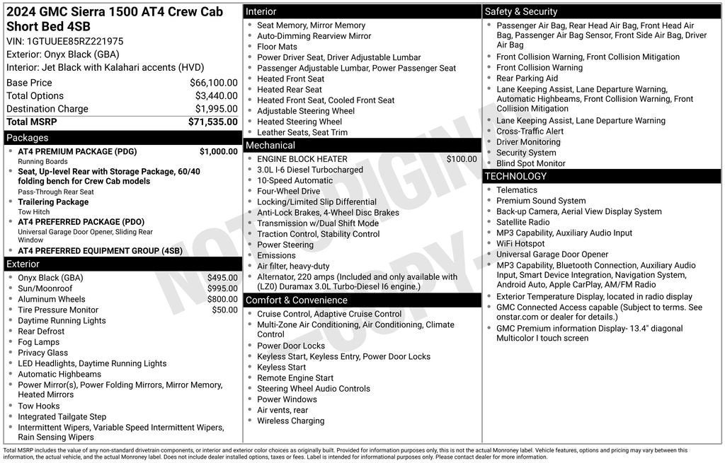 This 2024 GMC Sierra 1500 AT4 is a rugged and capable off-road pickup that's ready to take on any adventure. With its powerful 3.0L Duramax Turbo Diesel engine, advanced 4WD system, and premium off-road features, this Sierra AT4 is built to conquer the toughest terrain.- *** GM CERTIFIED PRE-OWNED ***- AT4 PREMIUM PACKAGE * POWER SUNROOF- LOCAL TRADE * CLEAN ACCIDENT HISTORY- SUNROOF, POWER- Onyx Black Exterior- 20 Machined Aluminum Wheels with Carbon Grey Metallic Accents- AT4 Preferred Package- AT4 Premium Package- Trailering Package- Premium Bose 7-Speaker Sound System- SiriusXM with 360L- Wireless Apple CarPlay/Android Auto- Heated and Ventilated Front Seats- Heated Rear Outboard Seats- Integrated Trailer Brake Controller- HD Surround Vision- Rear Cross Traffic Braking- Rear Pedestrian DetectionThis GMC Sierra 1500 AT4 comes with the peace of mind of being a GM Certified Pre-Owned vehicle. It has undergone a rigorous 172-point inspection, is backed by a 12-month/12,000-mile limited warranty, and includes 24 months/24,000 miles of scheduled maintenance. You also get roadside assistance, a $0 deductible, and a transferable warranty.Whether you're tackling off-road adventures, hauling heavy loads, or just enjoying the daily commute, this 2024 GMC Sierra 1500 AT4 is the perfect companion. Its combination of power, capability, and premium features make it a standout in the full-size truck segment. Schedule a test drive today and experience the uncompromising performance of the Sierra AT4.We are the #1 VOLUME GMC DEALER IN KENTUCKY! Every effort is made to ensure the accuracy of the information contained in this classified listing. Dealer is not responsible for errors or omissions as much of the information is compiled from 3rd party data source feeds. PRINT & BRING US THIS PAGE to the dealership for a 100% accurate equipment list of accessories, equipment & vehicle history. Late evening and Sunday appointments are available. Proudly serving: Bowling Green, Nashville, Hopkinsville, Clarksville, Campbellsville, Elizabethtown, Lebanon, Louisville, Russell Springs, Owensboro, Horse Cave, and greater Kentucky and middle Tennessee.