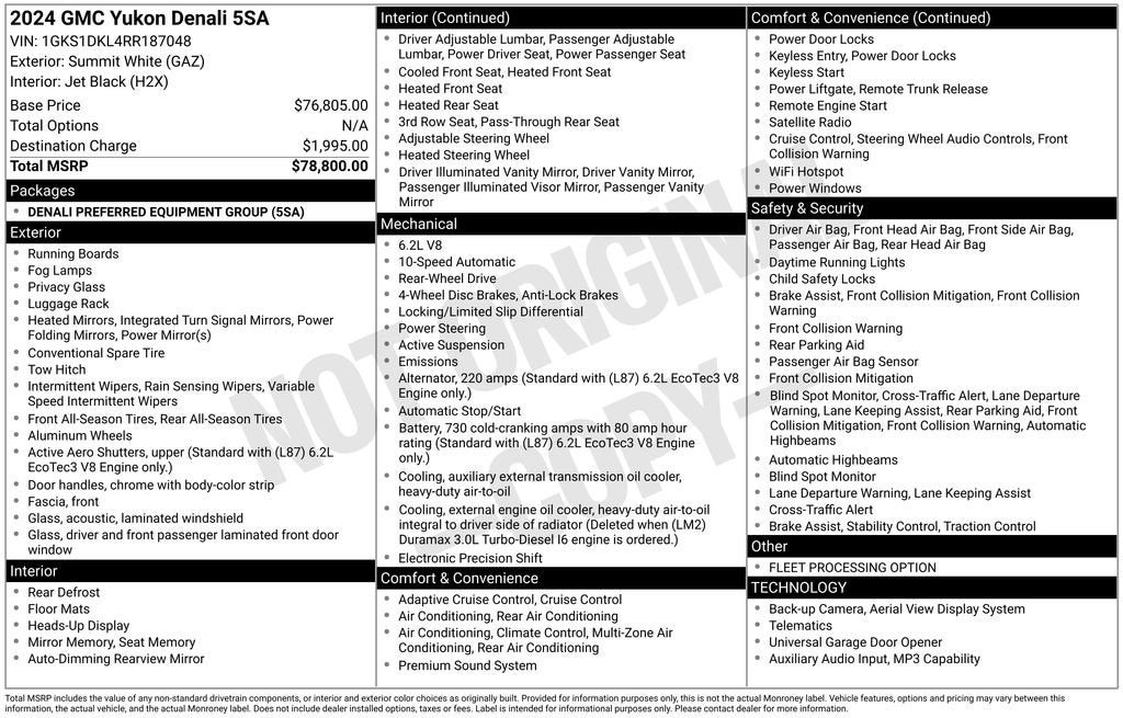 Elevate your driving experience with this stunning 2024 GMC Yukon Denali. This premium SUV boasts an exceptional blend of power, sophistication, and advanced technology, making it the ultimate choice for those seeking uncompromising performance and unparalleled luxury.- GM Certified Pre-Owned- One Owner with Clean Accident History- Apple CarPlay, Android Auto, and Wireless Charging- Heated and Ventilated Front Seats- Bose 14-Speaker Surround Sound System- Hands-Free Power Programmable Rear Liftgate- Heads-Up Display and Adaptive Cruise Control- Memory Seats and Steering WheelBeneath the bold, commanding exterior lies the powerful EcoTec3 6.2L V8 engine, paired with a responsive 10-Speed Automatic transmission, delivering an exceptional driving experience. With 14 MPG in the city and 20 MPG on the highway, this Yukon Denali strikes the perfect balance between power and efficiency.The interior of this Yukon Denali is a true sanctuary of refinement. Sink into the plush, perforated leather-appointed seats and enjoy the warmth of the heated steering wheel and front seats. The 15-inch Diagonal Multi-Color Head-Up Display and Bose 14-Speaker Surround Sound System provide an immersive, high-tech driving experience. With the Hands-Free Power Programmable Rear Liftgate, loading and unloading has never been easier.Safety is paramount in the Yukon Denali, with features like Forward Collision Alert, Lane Keep Assist with Lane Departure Warning, and Rear Pedestrian Alert ensuring you and your passengers are well-protected. The HD Surround Vision and Front & Rear Park Assist make navigating tight spaces a breeze.As a GM Certified Pre-Owned vehicle, this Yukon Denali comes with the peace of mind of a 172-point inspection, a 12-month/12,000-mile limited warranty, and a 72-month/100,000-mile powertrain warranty. Roadside assistance, a 3-day/150-mile vehicle exchange program, and a 24-month/24,000-mile scheduled maintenance plan further enhance the ownership experience.We are the #1 VOLUME GMC DEALER IN KENTUCKY! Every effort is made to ensure the accuracy of the information contained in this classified listing. Dealer is not responsible for errors or omissions as much of the information is compiled from 3rd party data source feeds. PRINT & BRING US THIS PAGE to the dealership for a 100% accurate equipment list of accessories, equipment & vehicle history. Late evening and Sunday appointments are available. Proudly serving: Bowling Green, Nashville, Hopkinsville, Clarksville, Campbellsville, Elizabethtown, Lebanon, Louisville, Russell Springs, Owensboro, Horse Cave, and greater Kentucky and middle Tennessee.
