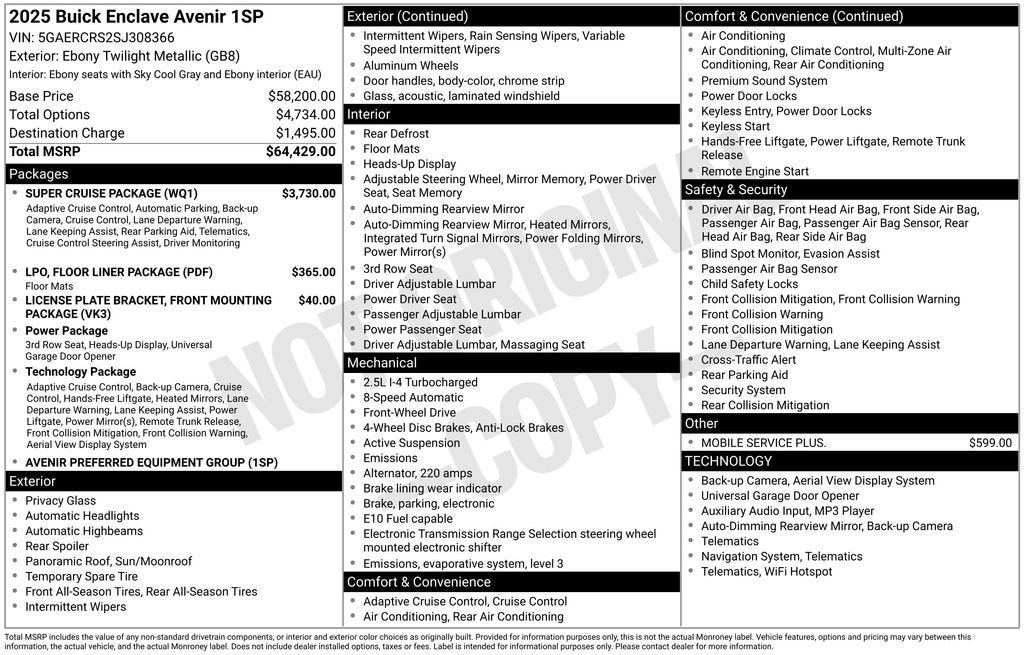 This Enclave Avenir is equipped with a host of premium features that elevate the driving experience. Indulge in the Bose Performance 16-Speaker Audio System, the Buick Infotainment System with SiriusXM, and the convenience of Wireless Apple CarPlay and Wireless Google Android Auto. The Heads-Up Display and Driver Attention Assist ensure you stay focused and informed behind the wheel.