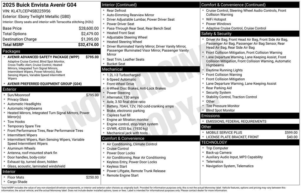 Certified.Buick Certified Pre-Owned Details:* Transferable Warranty* 172 Point Inspection* Vehicle History* Limited Warranty: 12 Month/12,000 Mile (whichever comes first) from certified purchase date* Warranty Deductible: $0* 24 months/24,000 miles (whichever comes first) Certified Pre-Owned Scheduled Maintenance Plan and 3 days/150 miles (whichever comes first) Vehicle Exchange Program. 1 month of OnStar Safety & Security Plan, Navigation Services, Remote Access Plan, and 1 month or 3GB of 4G LTE data (whichever comes first).* Roadside Assistance* Powertrain Limited Warranty: 72 Month/100,000 Mile (whichever comes first) from original in-service dateEbony Twilight Metallic 2025 Buick Envista Avenir FWD 6-Speed Automatic ECOTEC 1.2L TurboONE OWNER LOCAL TRADE * CLEAN ACCIDENT HISTORY, GM CERTIFIED PRE-OWNED, SUNROOF * AVENIR ADVANCED SAFETY PACKAGE, 8-Way Power Driver Seat Adjuster, Adaptive Cruise Control, Auto High-beam Headlights, Avenir Advanced Safety Package, Exterior Parking Camera Rear, Front Intermittent Rainsense Wipers, Heated Driver & Front Passenger Seats, Lane Change Alert w/Side Blind Zone Alert, Power Liftgate, Power Tilt-Sliding Moonroof w/Manual Sunshade, Power-Adjustable Outside Heated Mirrors, Preferred Equipment Group G04, Rear Cross Traffic Alert, Rear Parking Sensors, Telescoping steering wheel, Tilt steering wheel, Wheels: 19 Avenir Premium Pearl Nickel Aluminum, Wireless Apple CarPlay/Wireless Android Auto.Recent Arrival! Odometer is 8178 miles below market average! 28/32 City/Highway MPGEvery effort is made to insure the accuracy of the information contained in this classified listing. Dealer is not responsible for errors or omissions as much of the information is compiled from 3rd party data source feeds. PRINT & BRING US THIS PAGE to the dealership for a 100% accurate equipment list of accessories, equipment & vehicle history. Late evening and Sunday appointments are available.